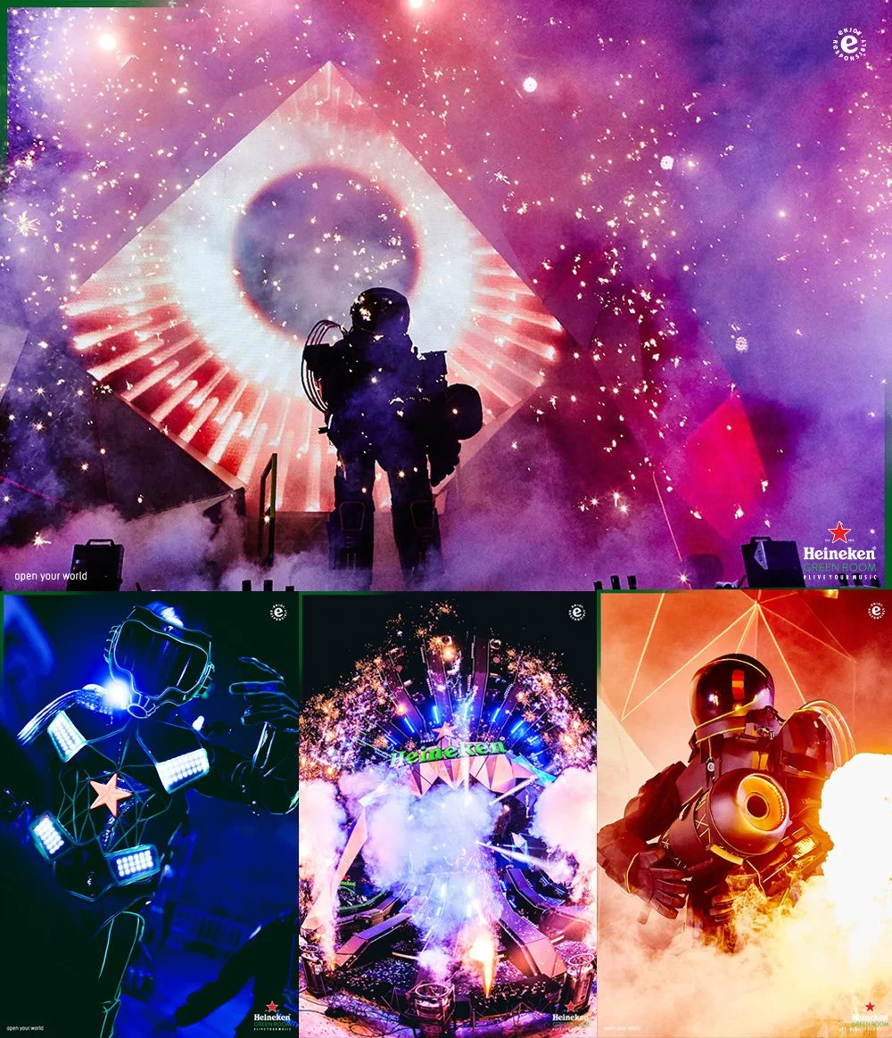 Every hour, a ‘Heineken moment’ unveils a new sonic droid, each droid being at least 2.5 meters tall with real-time audio reactive lights and an on-body camera that’s fed into a large screen in the area.